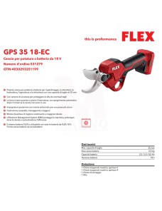 La sicurezza è un aspetto centrale: il sensore di sicurezza aiuta a proteggere le dita da eventuali tagli e la lama si apre solo quando si preme l'interruttore, con spegnimento automatico dopo 3 minuti se le cesoie non sono in uso, limitando sprechi di energia e rischi di azionamenti accidentali. La Flex GPS 35 18-EC fa parte del sistema batteria FLEX 18 V ed è compatibile con batterie da 2,5 / 5,0 / 8,0 Ah, permettendo di utilizzare gli stessi accumulatori su più utensili della gamma.