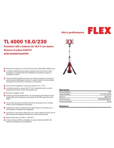 Scopri il Flex TL 4000 18.0/230 Proiettore LED a batteria da 18,0 V con stativo e Caricabatterie rapido 12 18 V e 1 batteria 2,5 ah inclusi. un faro potente a batteria ideale per illuminare cantieri e aree di lavoro con 3 livelli di luminosità: 1000, 2000 e 4000 lumen. La testa multifunzione si fissa con gancio o si monta su stativo regolabile in altezza da 1,1 a 2,2 m, con tre pannelli rotanti su due assi per un angolo luminoso personalizzabile, focalizzando la luce o coprendo superfici ampie. Compatibile con batterie FLEX 18 V, offre proiettore ruotabile di 180°, comando multifunzione con LED per livello di carica, USB-C, doppio On/Off e alimentazione elettrica opzionale a 230 V o 110/120 V tramite cavo cold plug (non fornito). L'attacco 1/4" lo rende versatile per laser a linee, videocamere e altro, garantendo installazione rapida e stabilità per professionisti esigenti.