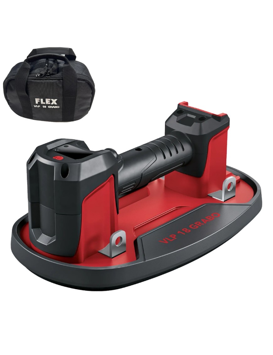 Sollevatore a vuoto Flex VLP 18.0 C Grabo 18V: portatile ed ergonomico, maneggia con precisione fino a 130 kg (massimo 170 kg) su superfici ruvide, polverose o porose come piastrelle, lastre, vetro, metalli e arredi. Pompa a vuoto automatica con stop, indicatore digitale pressione, rilascio sequenziale e gestione EMS per protezione e prestazioni ottimali; compatibile con batterie FLEX 18V (escluse).