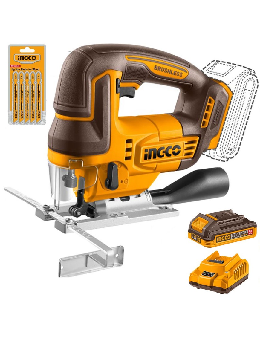 Seghetto alternativo a batteria INGCO CJSLI1008 20V, solo corpo, ideale per tagli rapidi e versatili su legno e metallo. Il motore raggiunge 3000 giri al minuto, permettendo tagli fino a 110 mm nel legno e 12 mm nel metallo, adatto a lavori di fai da te e piccoli interventi professionali. Fornito con 5 lame per diverse applicazioni e con 1 batteria 2 ah e un caricabatterie rapido