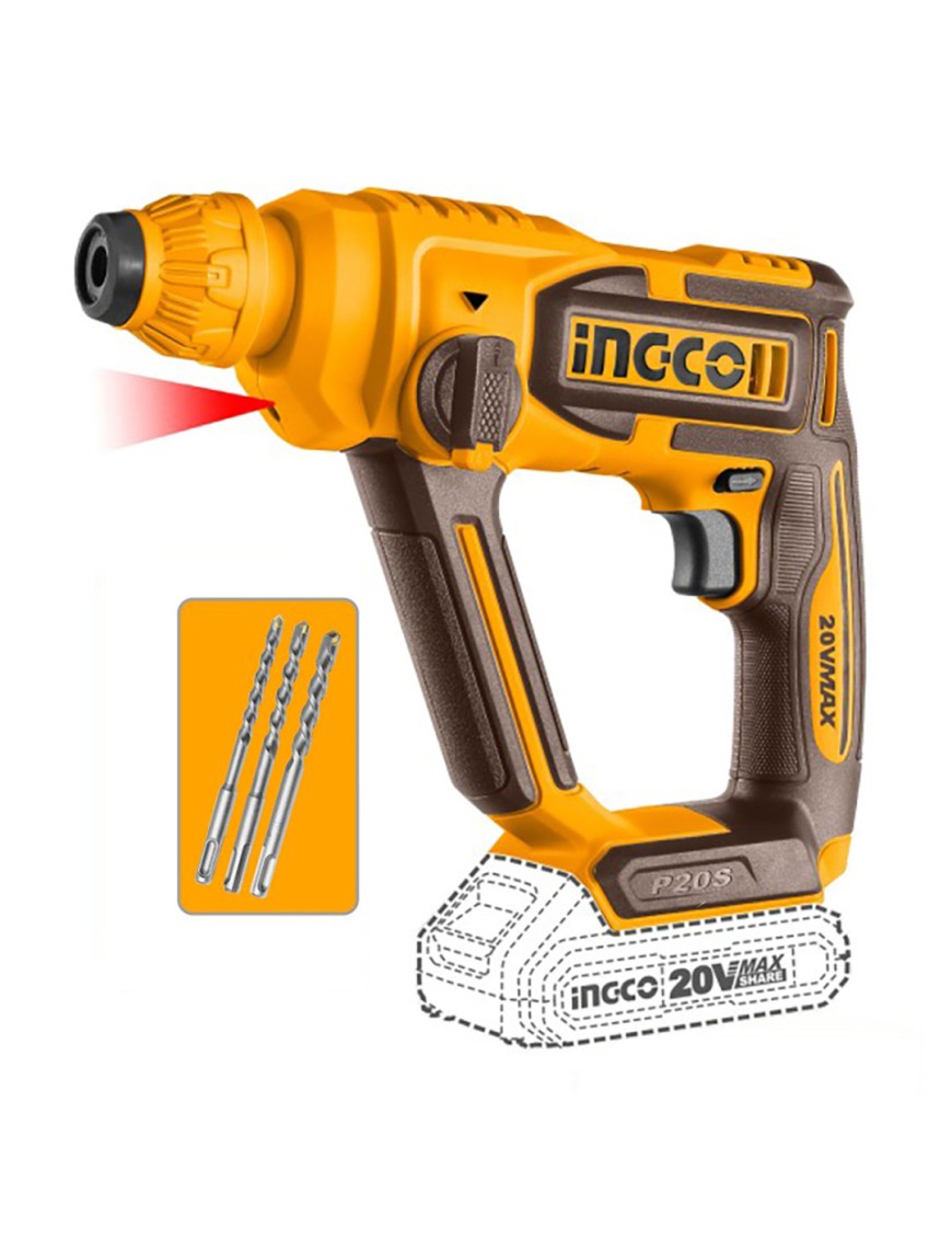 Martello demolitore a batteria Ingco CRHLI20168 da 20V, ideale per lavori di foratura e tassellatura. Offre 1,5J di energia d'impatto, mandrino SDS Plus e 2 funzioni (rotazione + percussione). Capacità di foratura max Ø16 mm nel calcestruzzo (range ottimale Ø4–10 mm), Ø20 mm nel legno e fino a 100 mm nell'acciaio. Dotato di luce LED integrata per una migliore visibilità. In dotazione 3 punte. Batteria e caricabatterie non inclusi.