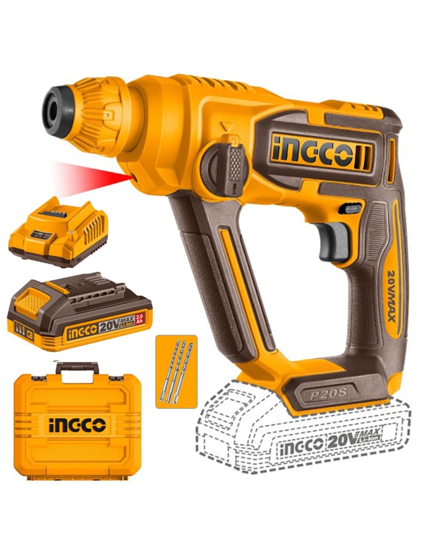 Martello demolitore a batteria Ingco CRHLI20168 da 20V, ideale per lavori di foratura e tassellatura. In questa offerta (CRHLI201681E) proponiamo il tassellatore a batteria completo di batteria e caricabatterie 2 ah, valigetta e 3 punte.