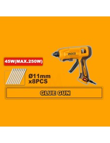 Ingco GG408 pistola termocollante 45W (220-240V) con 8 stick da 11,2 mm x 150 mm inclusi, riscalda in 3-5 minuti erogando 20-30 g/min di colla calda per fissaggi veloci e precisi su legno, plastica e materiali fai-da-te.