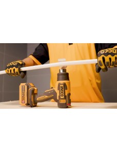 Termosoffiatore a batteria Ingco HGLI2003 da 20V con temperatura regolabile da 30 a 550°C e flusso d'aria 100/200 L/min, dotato di display LCD per un controllo preciso del calore, ideale per rimuovere vernici, termorestringenti e lavori di manutenzione professionale e hobbistica. In dotazione ugello di riduzione, ugello riflettore, ugello piatto e raschietto. Batteria e caricabatterie 2 ah inclusi.