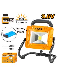 Faretto LED ricaricabile Ingco HRLF4415 con batteria integrata da 5000mAh, ideale per illuminare postazioni di lavoro, emergenze e uso outdoor. Offre due livelli di luminosità, 900 lumen in modalità alta e 500 lumen in modalità bassa, con autonomia fino a 2,5 ore in alto e 4 ore in basso, ricaricabile in circa 6 ore tramite cavo USB incluso.