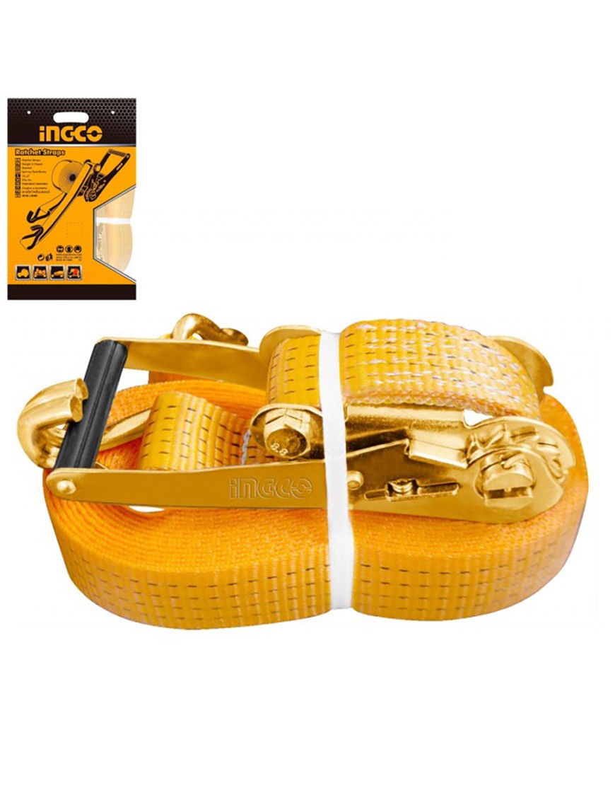 Ingco HRSP5101 Cinghie a cricchetto 10m x 50mm da 5T: fissaggio sicuro e robusto con carico massimo 5 tonnellate, cricchetto integrato e ganci a doppio J per tensionare facilmente carichi pesanti su furgoni, rimorchi o piattaforme. Lunghezza 10m e larghezza 50mm ideali per trasporti professionali.