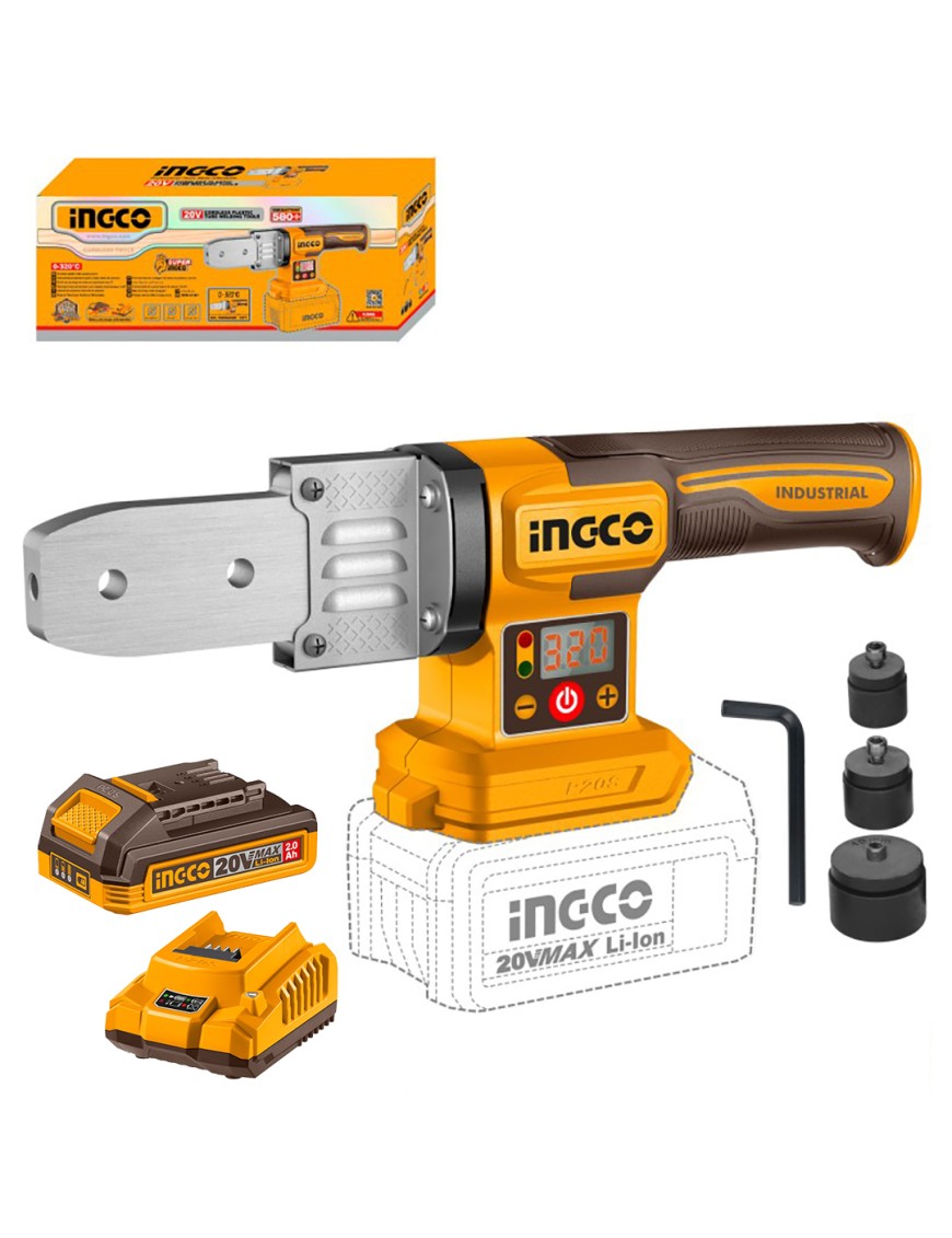 Ingco PTWTLI2018 Saldatubi a Batteria 20V. Saldatubi a batteria compatto e potente, ideale per la saldatura di tubi in plastica come PP-R, PB, PE e PE-RT. Raggiunge una temperatura nominale di 0–320 °C e include 3 matrici da 20, 25 e 32 mm con chiave esagonale per un rapido cambio. Perfetto per lavori precisi e mobili grazie all'alimentazione a 20 V.