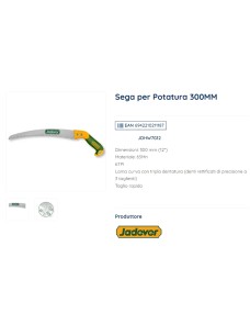 Sega per potatura Jadever JDHW7G12 con lama curva da 300 mm (12"), studiata per tagli rapidi e puliti su rami e potature da giardino. La lama in acciaio 65Mn con tripla dentatura a 3 taglienti (6 TPI) assicura un taglio aggressivo e preciso, riducendo lo sforzo durante il lavoro. Ideale per hobbisti e appassionati di giardinaggio che cercano una sega maneggevole e performante per potature veloci ed efficaci.