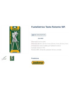 Fustellatrice testa rotante Jadever JDLH1801, 10" (25,4 cm) professionale per fori precisi su pelle, tessuti e cuoio. Include 6 misure fori: 2,5 mm, 3 mm, 3,5 mm, 4 mm, 4,5 mm, 5 mm. Articolazione snodata anti-sforzo, manico comodo in PVC ergonomico, struttura robusta in 40Cr temprato spessore 1,8 mm cromato per massima durata. Ideale per artigiani, pelletteria, hobbistica e fai-da-te. Fustellatrice pelle Jadever JDLH1801 con leva a doppio snodo, foratura pulita e precisa.
