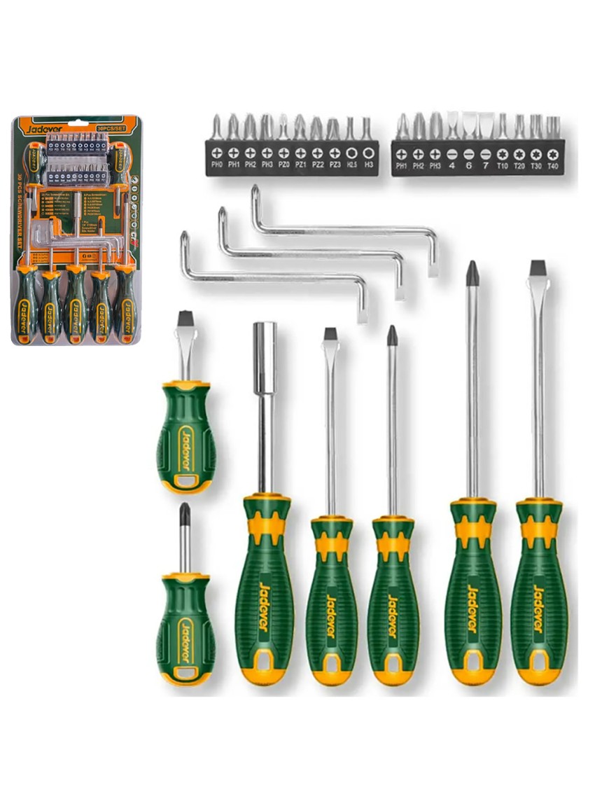 Il set di 30 cacciaviti Jadever è un kit completo e professionale, progettato per soddisfare le esigenze di artigiani, meccanici e appassionati di fai-da-te. Realizzato in acciaio di alta qualità CR-V (cromo-vanadio), garantisce un'eccellente resistenza all'usura, alla corrosione e una lunga durata nel tempo.