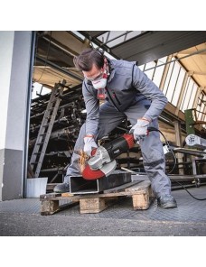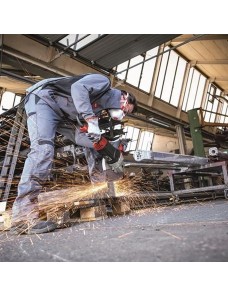Smerigliatrice angolare Flex L 2200 230 con potente motore da 2200 W e disco da 230 mm, ideale per pesanti lavori di taglio e sbavo su metallo e materiali da costruzione. La robusta carcassa del motore e dell'ingranaggio in acciaio, con cuscinetto del mandrino protetto da coperchio metallico, assicura affidabilità e lunga durata. L'impugnatura posteriore con inserto antiscivolo offre una presa sicura, mentre soft start, blocco contro le partenze dopo l'interruzione di corrente, arresto dell'albero e cuffia di protezione regolabile senza chiavi garantiscono maggiore sicurezza e praticità d'uso.
