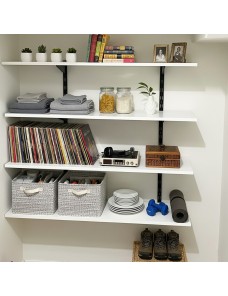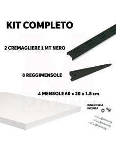 Set completo di 4 mensole bianche da 60x20 cm con supporto su cremagliera da 1 metri. Il kit include 2 cremagliere in acciaio verniciato nero da fissare a parete, 8 reggimensole e 4 mensole in finitura bianca. Ideale per creare scaffalature robuste e funzionali in casa, ufficio o garage.