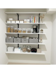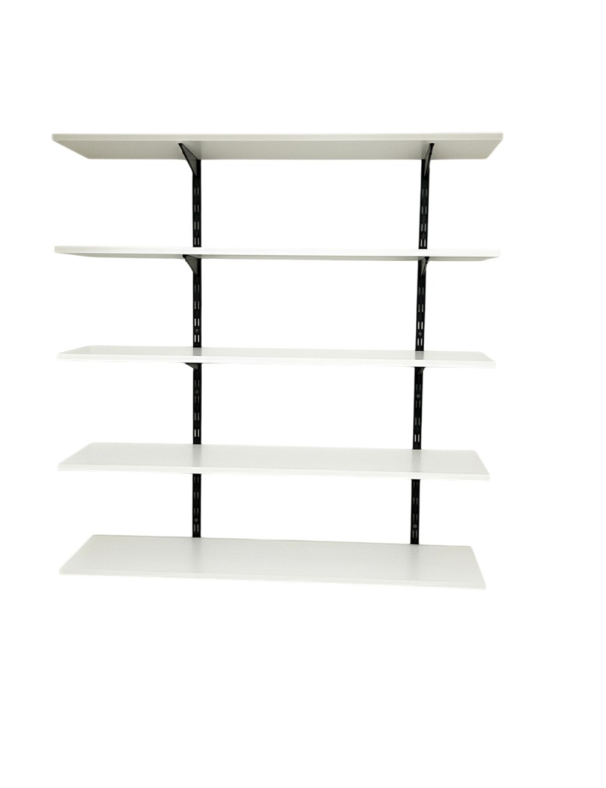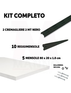 Set completo di 5 mensole bianche da 80x20 cm con supporto su cremagliera da 2 metri. Il kit include 2 cremagliere in acciaio verniciato nero da fissare a parete, 10 reggimensole e 5 mensole in finitura bianca. Ideale per creare scaffalature robuste e funzionali in casa, ufficio o garage.