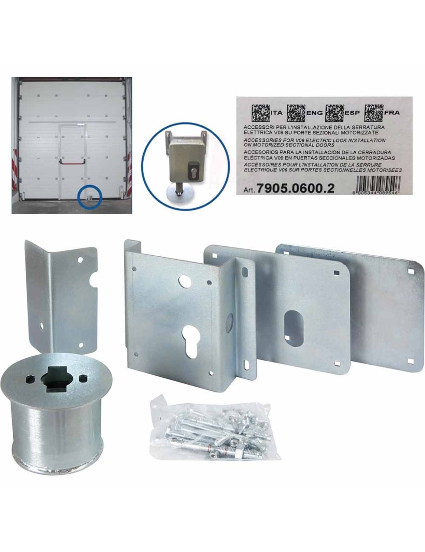 Accessori per l'installazione della serratura elettrica V09 su porte sezionali motorizzate.