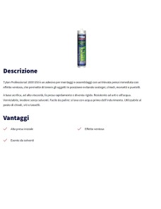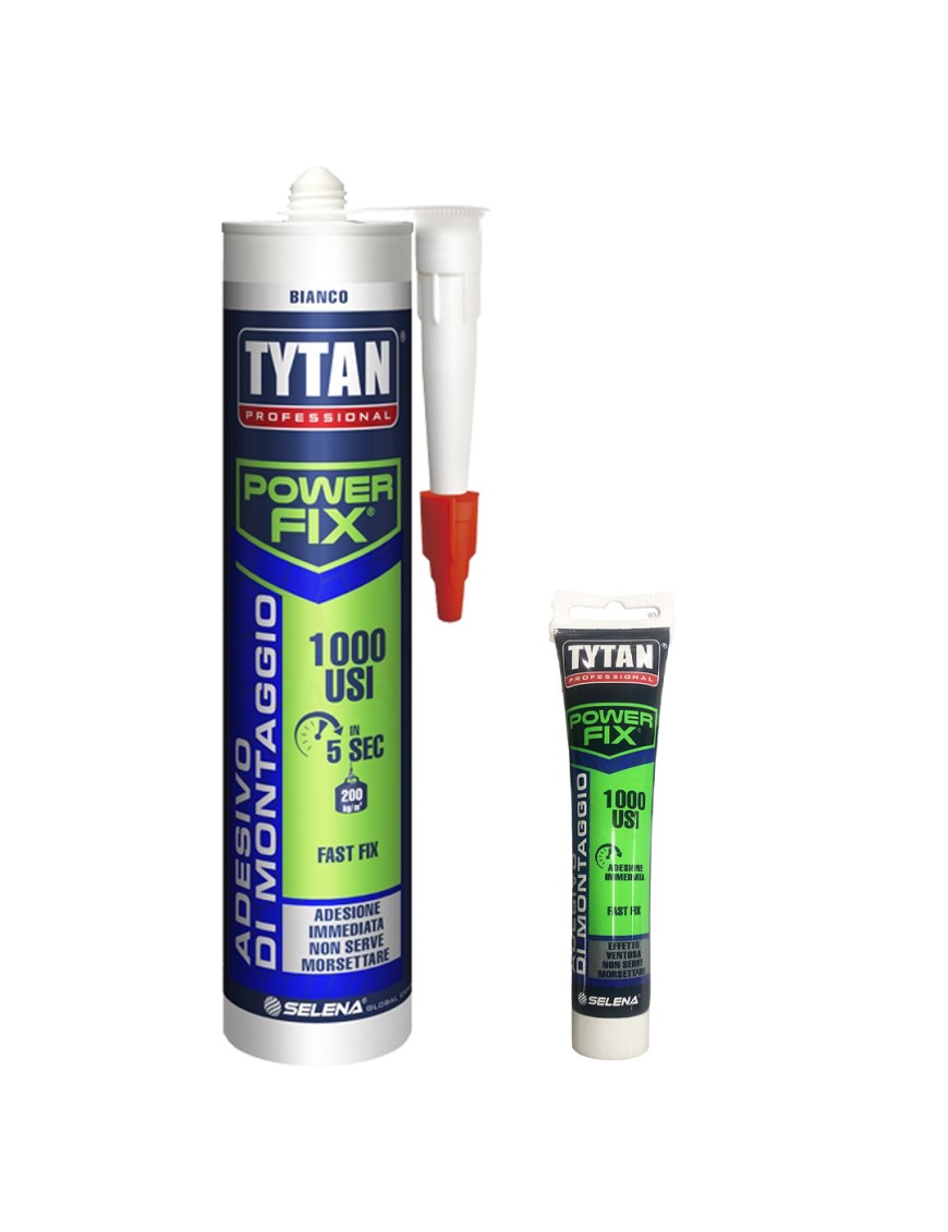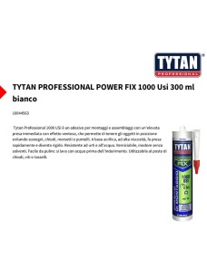 Tytan Professional 1000 USI è un adesivo per montaggi e assemblaggi con un'elevata presa immediata con effetto ventosa, che permette di tenere gli oggetti in posizione evitando sostegni, chiodi, morsetti o puntelli. A base acrilica, ad alta viscosità, fa presa rapidamente e diventa rigido. Resistente ad urti e all'acqua. Verniciabile, inodore senza solventi. Facile da pulire: si lava con acqua prima dell'indurimento. Utilizzabile al posto di chiodi, viti o tasselli.