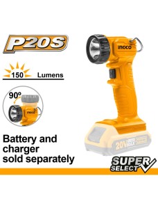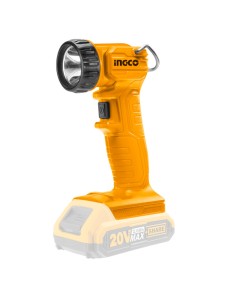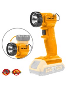 Lampada da lavoro a batteria Ingco CWLI2023 da 20 V con testa rotante fino a 90° e visibilità fino a 150 lumen. Batteria e carica batterie sono venduti separatamente.