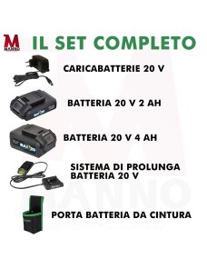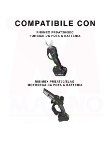 Mini sega a batteria 20 V Ribimex completa di accessori. Questa elettrosega fa parte della serie 20 V Ribimex che permette di alimentare decine di attrezzi diversi con la stessa batteria.