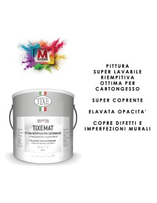Utilizzata per supporti murali particolarmente rappezzati e disomogenei (come il cartongesso, i pannelli prefabbricati e l'intonaco) su cui si voglia evitare l'applicazione di più strati, velocizzando così le operazioni di imbiancatura già in mano singola. La particolare formula di TIXEMAT, permette l'applicazione diretta su muri non particolarmente assorbenti, senza utilizzo preventivo di fissativo. TIXEMAT unisce l'elevato potere coprente e punto di bianco, ad una opacità molto spinta in grado di mascherare difetti e imperfezioni murali. L'elevata lavabilità di TIXEMAT, consente l'impiego in ambienti particolarmente frequentati che necessitino di pulizia.