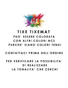 NOTA BENE: Richiedere TIXEMAT colorato rappresenta una personalizzazione. Per i prodotti personalizzati in Italia non è possibile effettuare il reso. I colori sono totalmente indicativi. Non sono accettati rimborsi per colorazioni non perfette. Fare riferimento ai codici. Le impostazioni dello schermo di chi guarda può modificare la percezione del colore. Il tasso di lamentele rispetto al colore ordinato è comunque bassissimo. Per questo prodotto utilzziamo la scala cromatica standard NCS quindi potete fare riferimento a quello.
