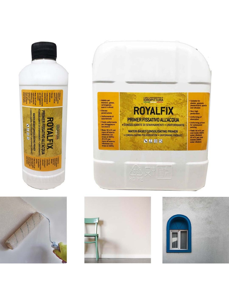 Utilizzato per supporti murali interni o esterni particolarmente sfarinanti e dall'elevato assorbimento, ROYALFIX migliora la pennellabilità e l'adesione delle pitturazioni successive. ROYALFIX facilità l'omogeneità di colore per superfici murali ripristinate con rappezzi a calce o stucco, e grazie all'elevata penetrazione negl'interstizi, agevola l'ottenimento degli spessori voluti con idropitture, aumentando anche le coperture. ROYALFIX necessita diluizione con acqua 400% per uso interno e 300% per uso esterno. Aspetto della pellicola essiccata: trasparente. Non applicare il prodotto su superfici trattate con pitture altamente lavabili.