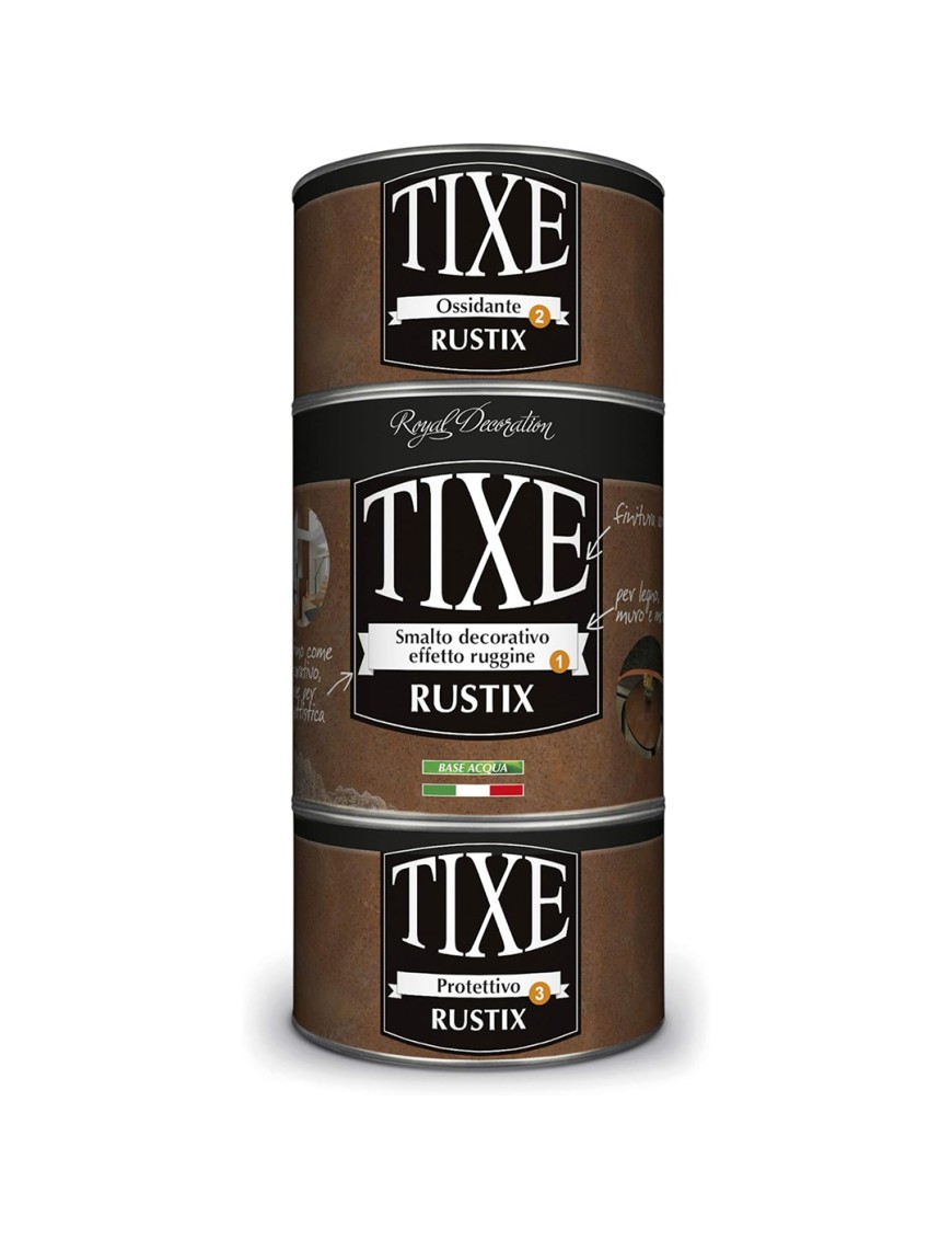 Il prodotto è composto da uno smalto base (ferro o rame), da un attivatore ossidante, da un neutralizzante protettivo. I tre componenti si utilizzano in successione. RUSTIX è ideale per la decorazione di qualsiasi supporto opportunamente preparato (plastica, ferro, legno), in modo particolare per mobili e pareti interne, a cui si voglia conferire un aspetto antichizzato e rustico.