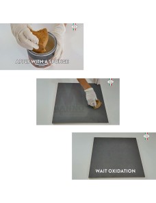 2° fase: RUSTIX OSSIDANTE applicabile dopo 12 ore e non oltre le 72 ore dalla stesura dell'ultima mano di base, usando un pennello o una spugna, e facendo attenzione ad indossare guanti protettivi per evitare contatti con la pelle. Occorre mantenere lo strato di ossidante sulla superficie per almeno 1 ora. Per iniziare a notare l'ossidazione, occorre che l'ossidante sia asciutto da almeno mezz'ora. L'ossidazione si protrae fino a che non si applica il Protettivo. È possibile non applicare ossidante in alcune parti, per alternare zone ossidate a quelle non.