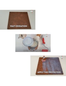 3° fase: RUSTIX PROTETTIVO si usaper bloccare la reazione di ossidazione, e deve essereapplicato quando l'ossidante ha modificato il colore della base(già dopo un paio d'ore), preferibilmente non oltre le 24 ore. Il colore che si raggiunge con l'ossidante sulla base ferro, non sarà già rossiccio, ma brunoscuro: la tinta diventerà rossiccia ruggine, dopo applicazione del protettivo. L'applicazione del protettivo deve essere eseguita con pennello o preferibilmente rullo, asciugando/tamponando con un panno eventuali residui di ossidante ancora presente. Più mani vengono applicate, maggiore sarà la protezione e resistenza.